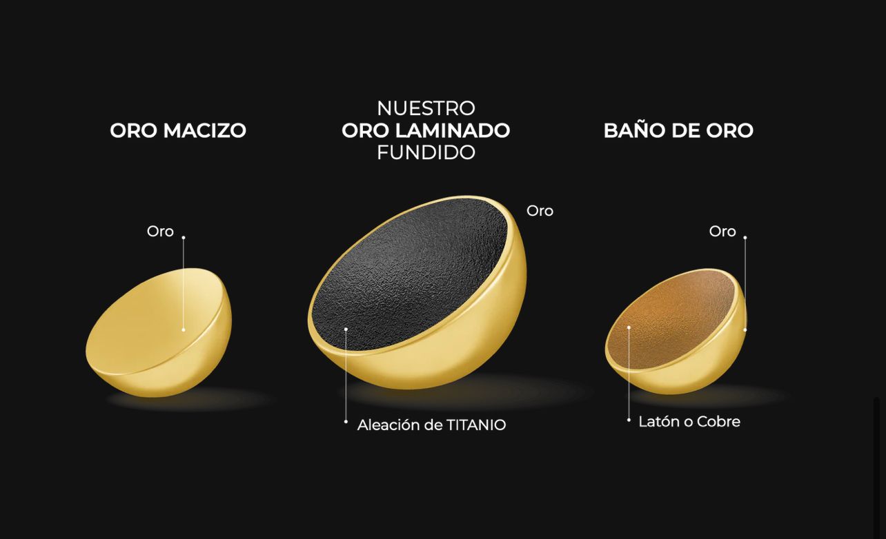 Una joya que combina una base de titanio resistente con una gruesa capa de oro de 18 quilates fusionada mediante un proceso de alta presión y calor, creando un "blindaje" permanente que ofrece la apariencia del oro macizo pero es mucho más asequible. No pierde su color ni se opaca, y resiste el uso diario, el sudor, el agua de mar y las lociones.